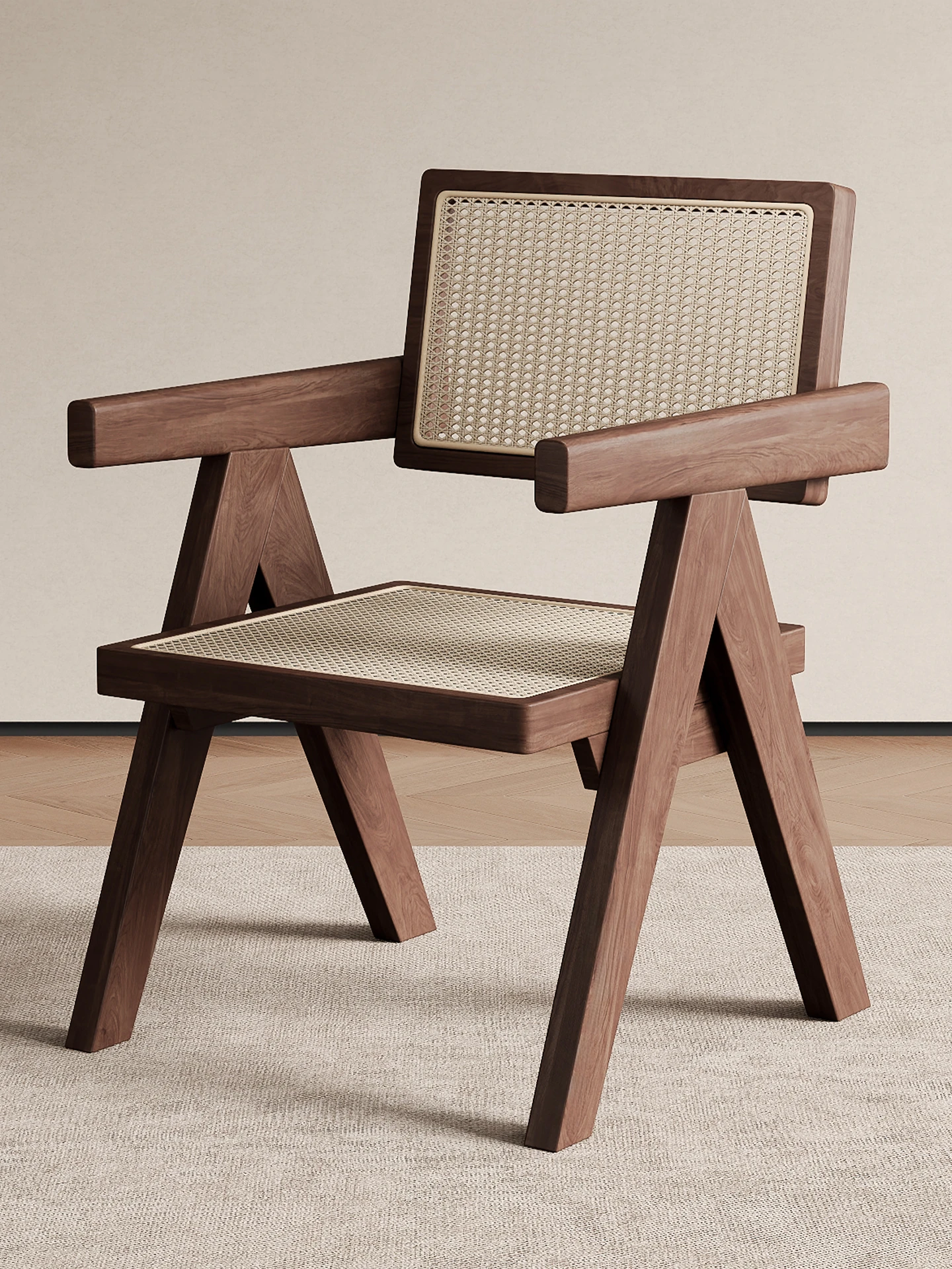 Soft Upholstered Armchair with Rattan Backrest - Vintage Style Solid Wood Dining Chair for Home, Inspired by Chandigarh Design and Wabi-Sabi Aesthetics. Perfect for Relaxation and Elegant Dining Spaces.