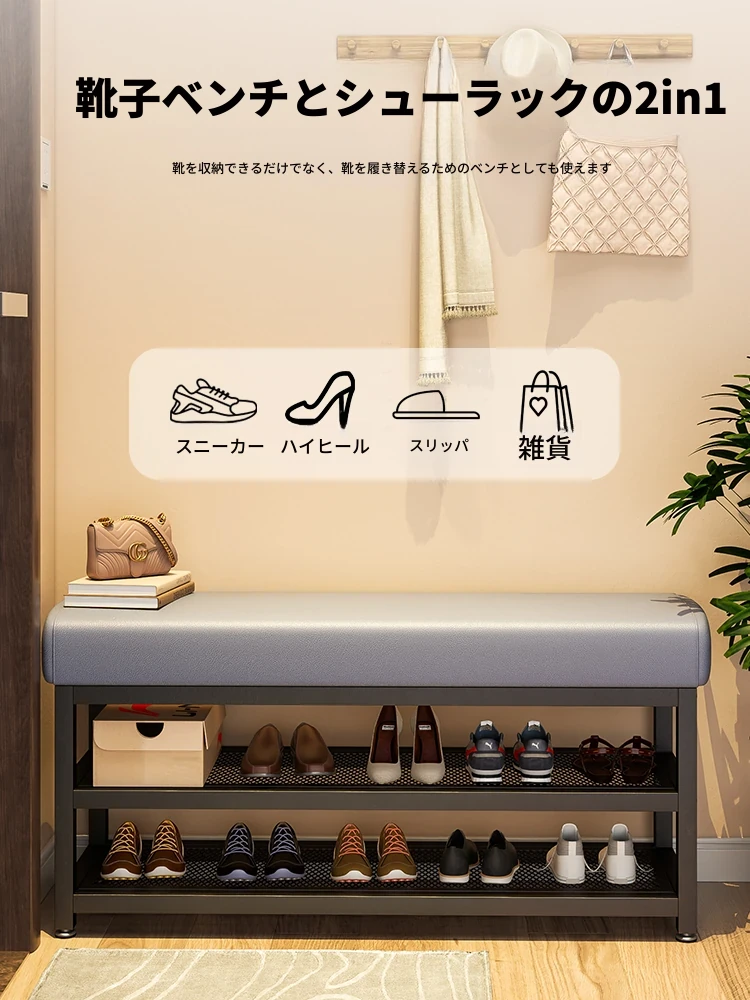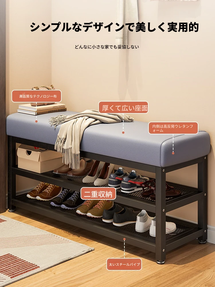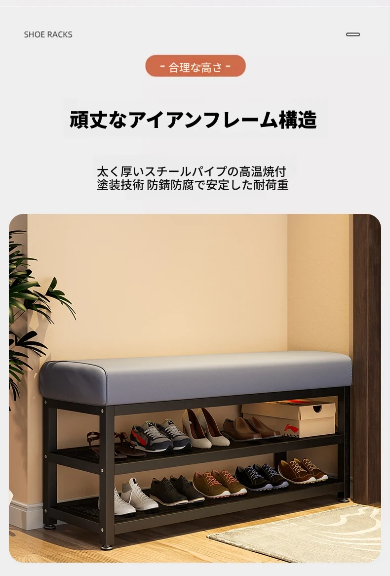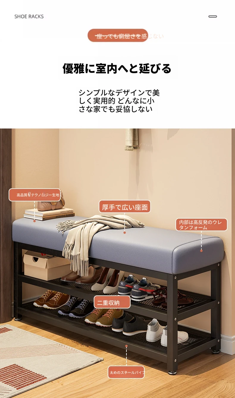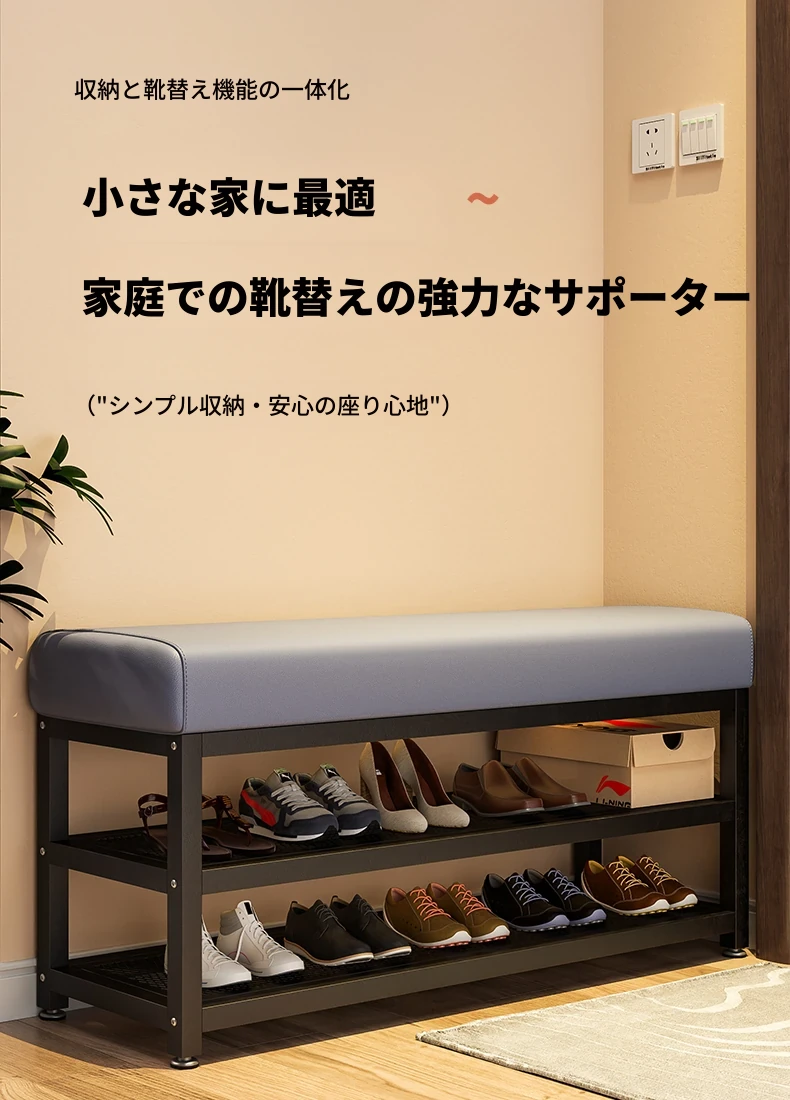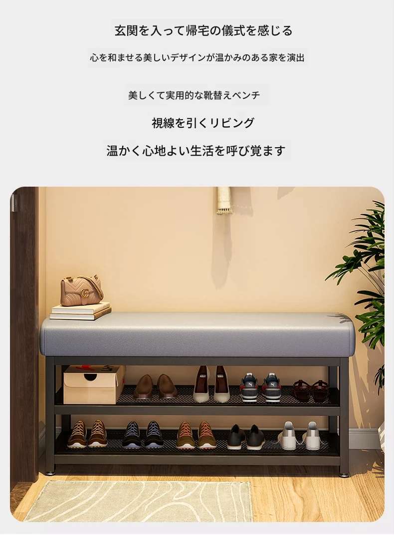 高級感漂うシンプルなデザインの玄関用スリッパベンチ!靴を履く際の便利な収納スペース付き。おしゃれな長方形のシューズラックで、家の入り口を洗練された雰囲気に演出します。座れる&収納できる便利さを兼ね備えたアイテムです!