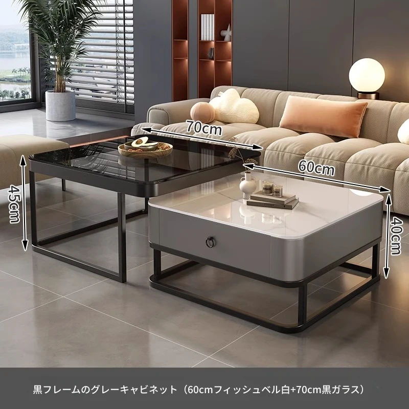 ローテーブルテレビキャビネットセット⭐黒フレーム灰キャビネット⭐明るい雪山白+黒ガラス