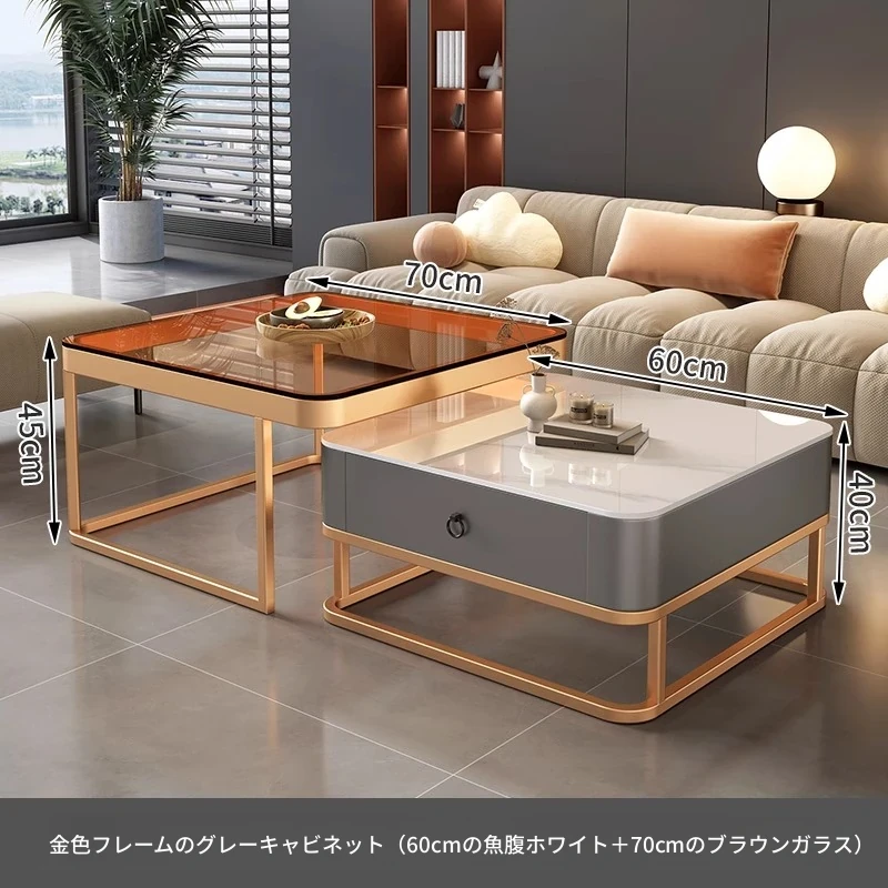 ローテーブルテレビキャビネットセット⭐金フレーム灰キャビネット⭐明るいモダングレー+茶色ガラス