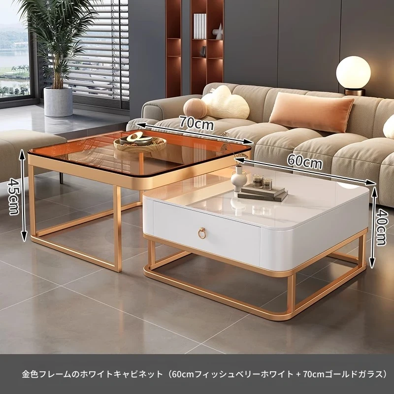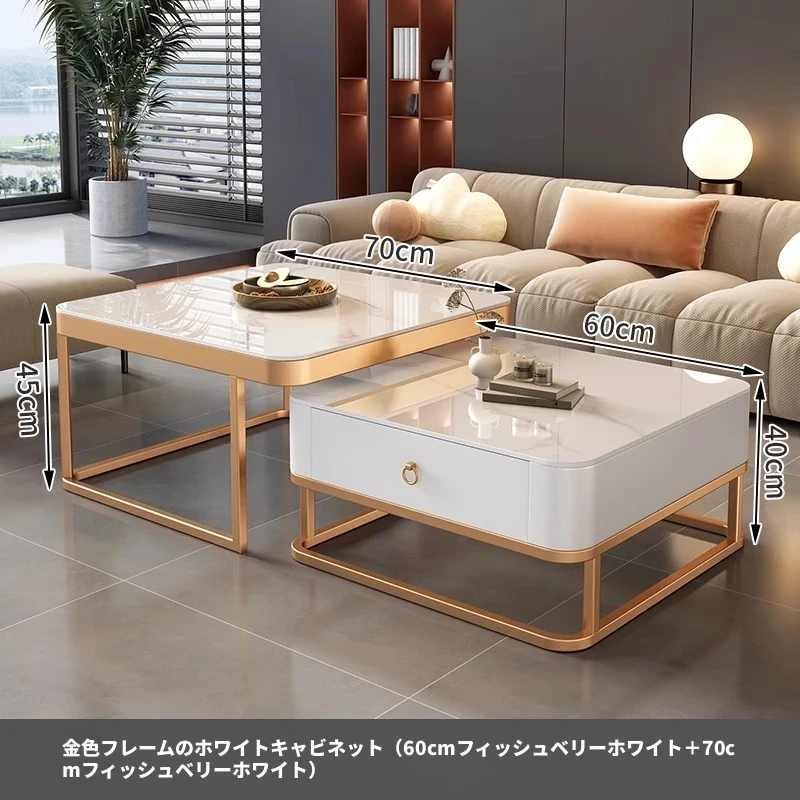 ローテーブルテレビキャビネットセット⭐金フレーム白キャビネット⭐明るい雪山白+茶色ガラス
