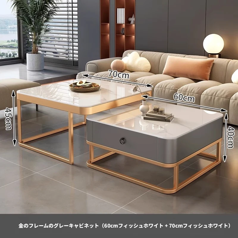 ローテーブルテレビキャビネットセット⭐金フレーム白キャビネット⭐明るいモダングレー+茶色ガラス
