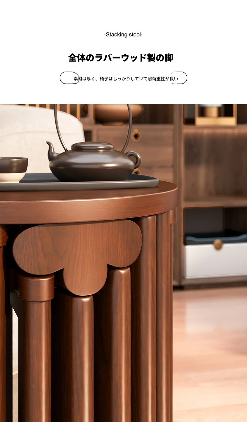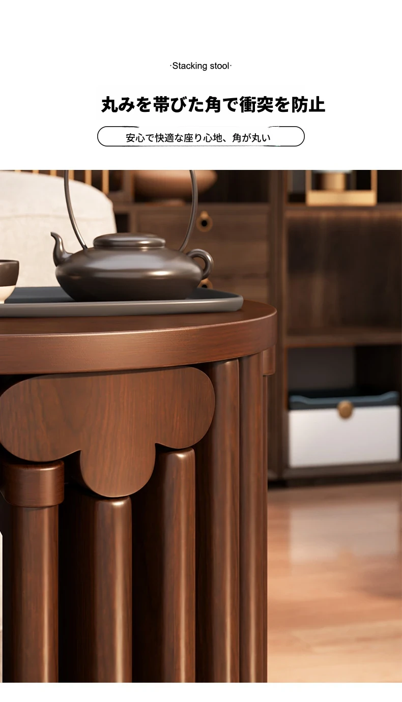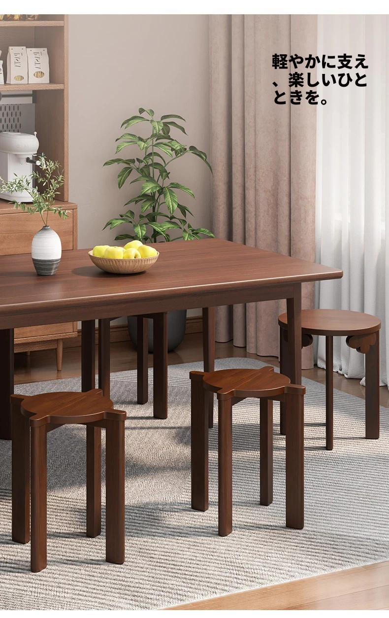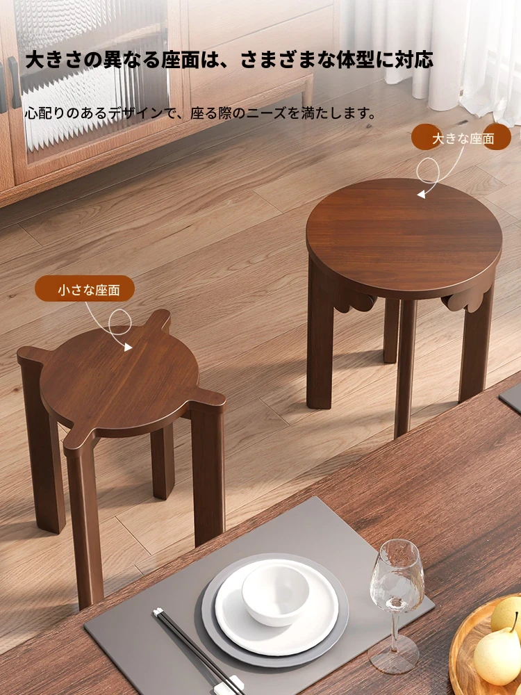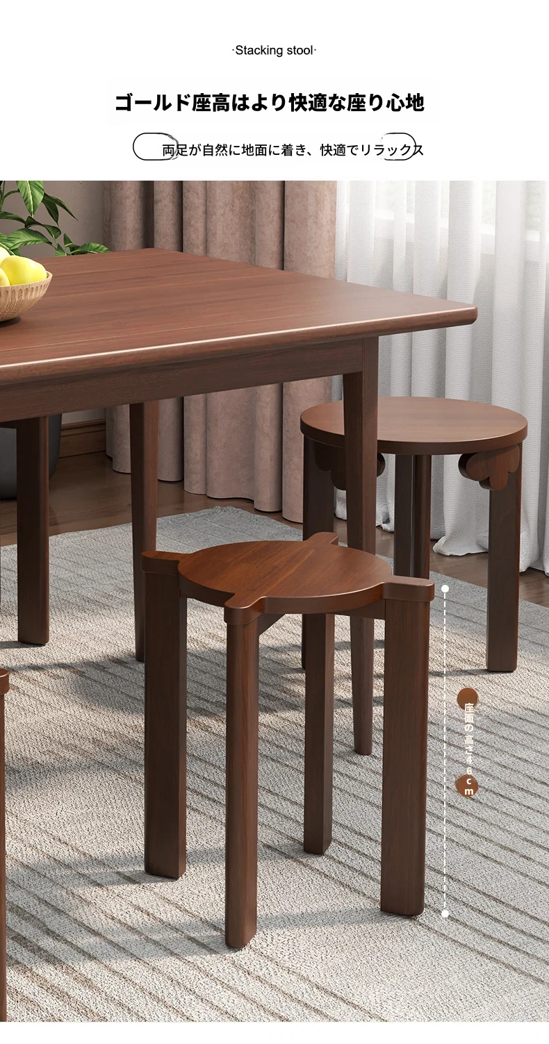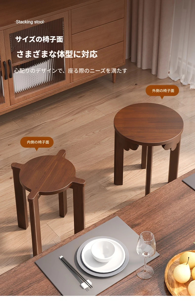 現代的な木製ダイニングスツール - 丸型デザインでおしゃれな食卓を演出!家庭用に最適なスタッキング可能なスツール。新中式のテイストで、シンプルながらも洗練された雰囲気を提供します。