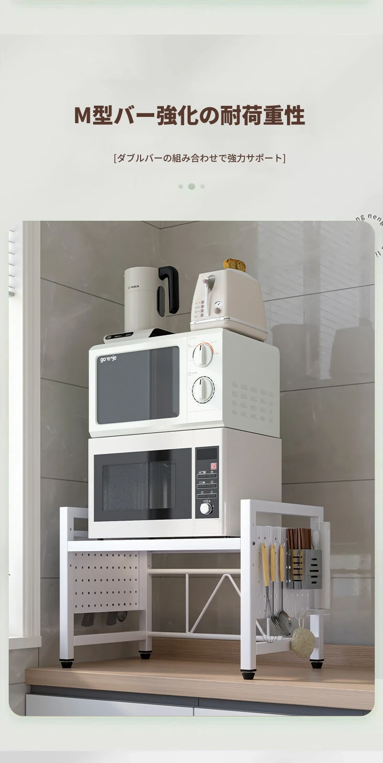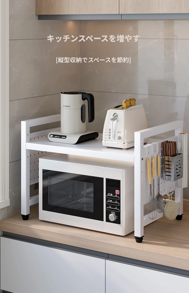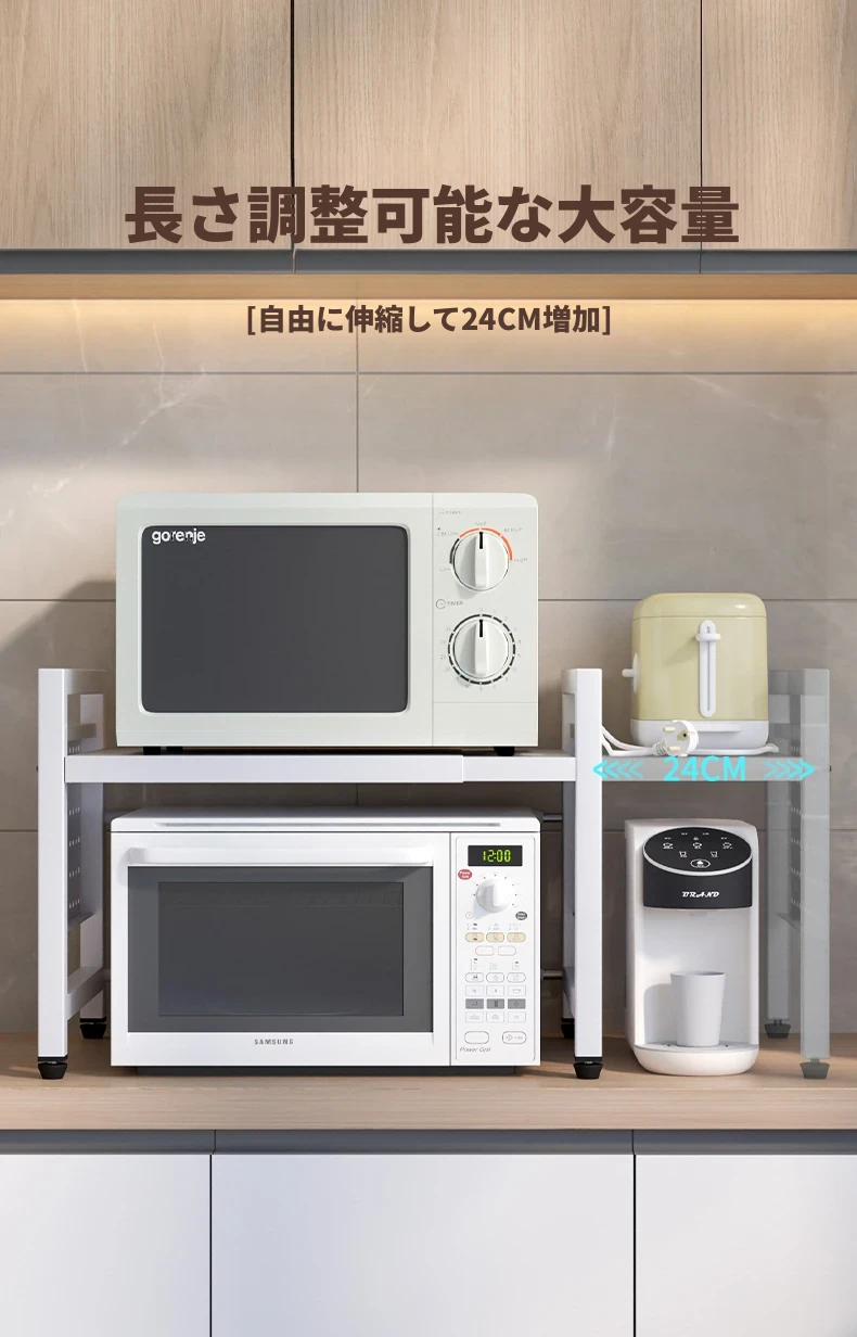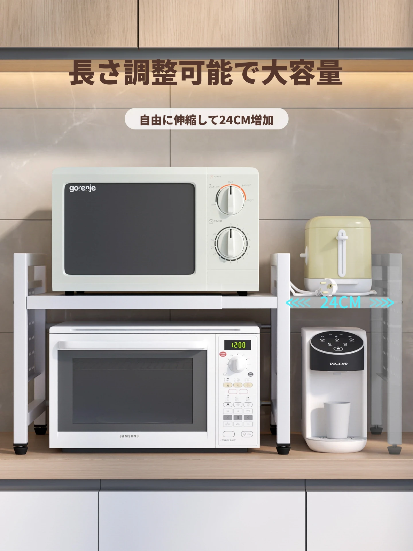 キッチンカウンター用多機能電子レンジラック!二段式の伸縮可能な収納棚で、オーブンや炊飯器をスッキリ整理。限られたスペースを有効活用し、料理の効率をアップ!