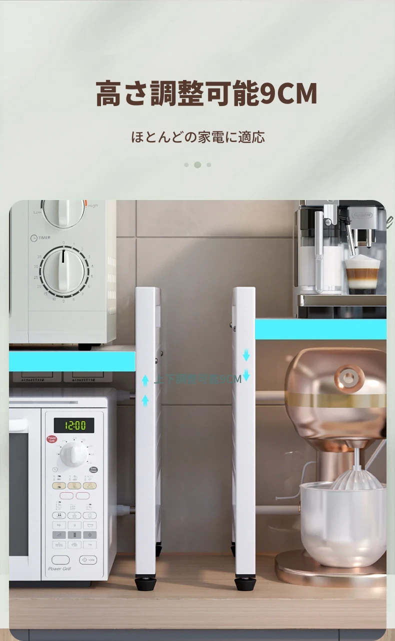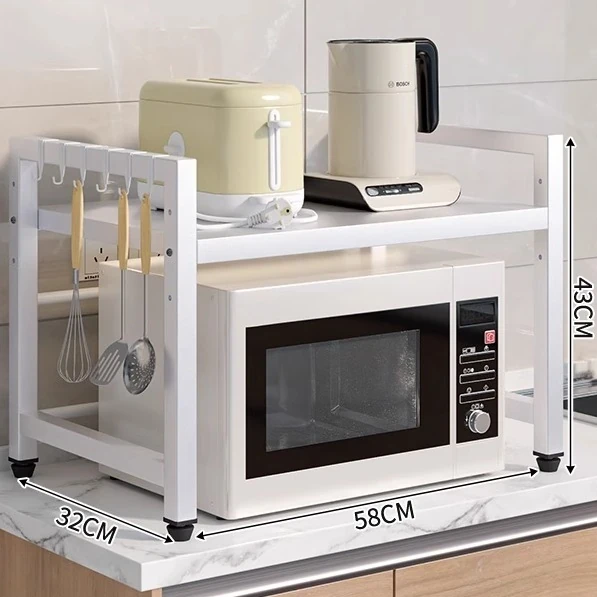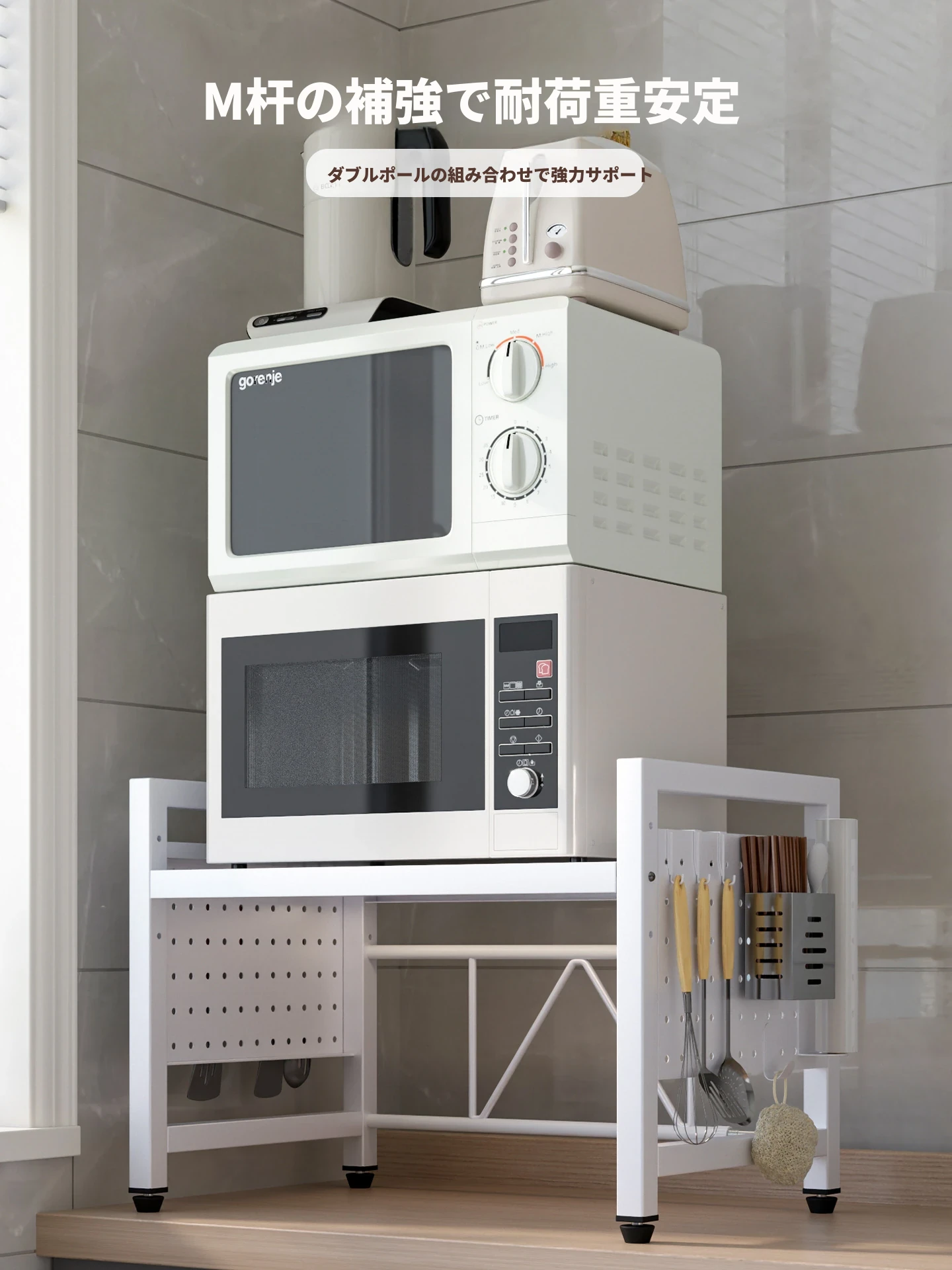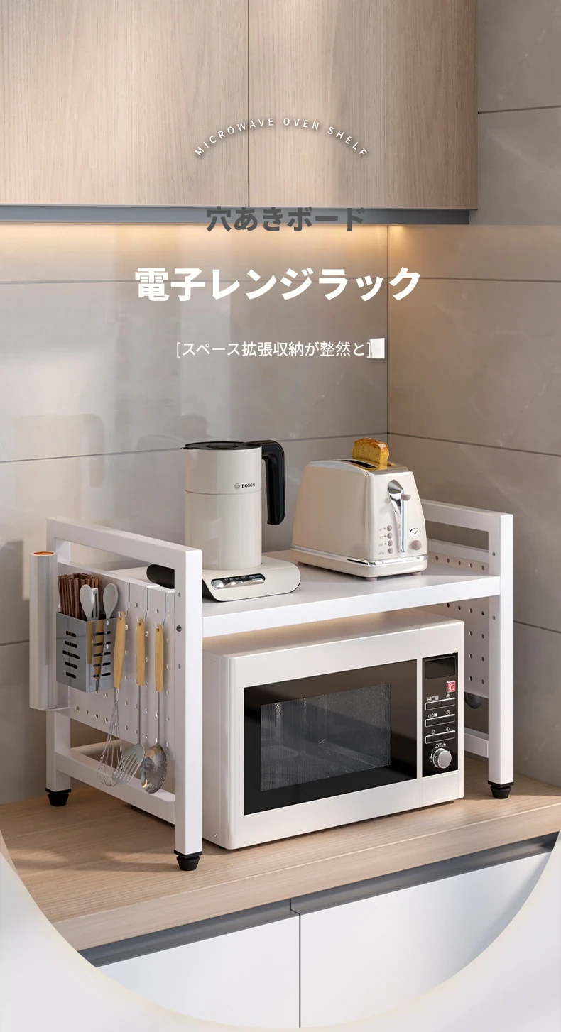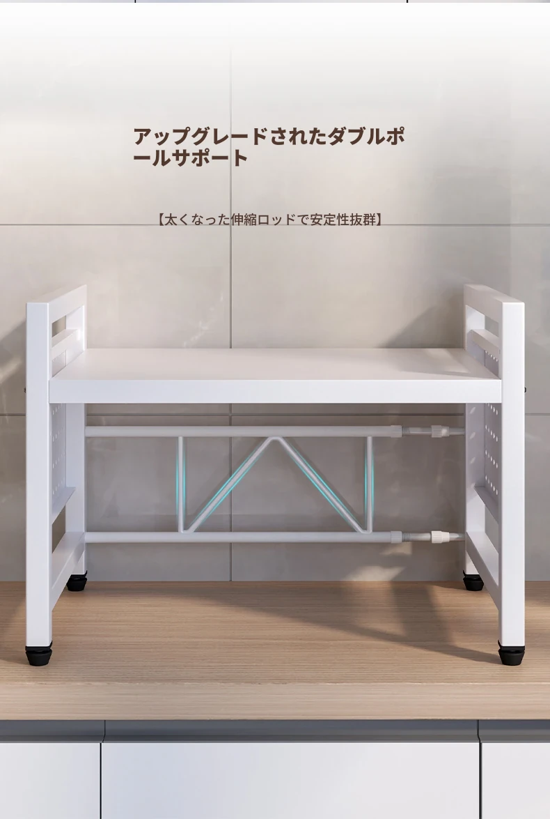 キッチンカウンター用多機能電子レンジラック!二段式の伸縮可能な収納棚で、オーブンや炊飯器をスッキリ整理。限られたスペースを有効活用し、料理の効率をアップ!