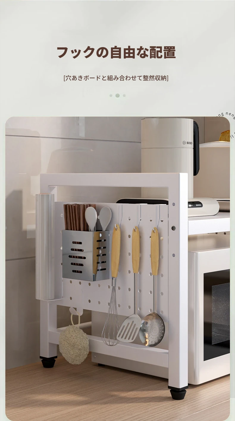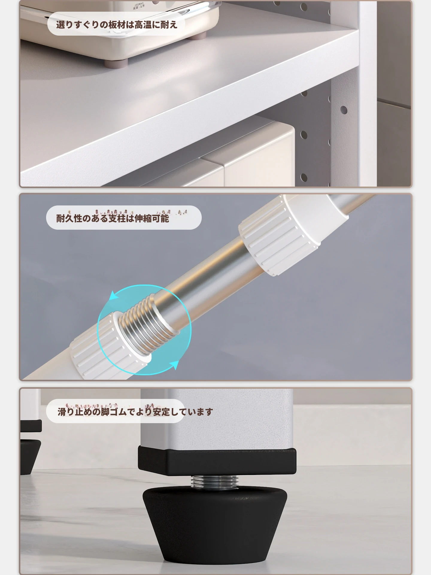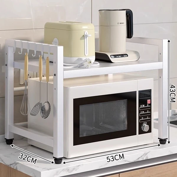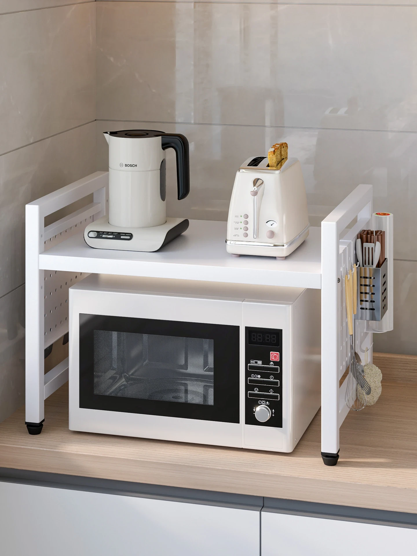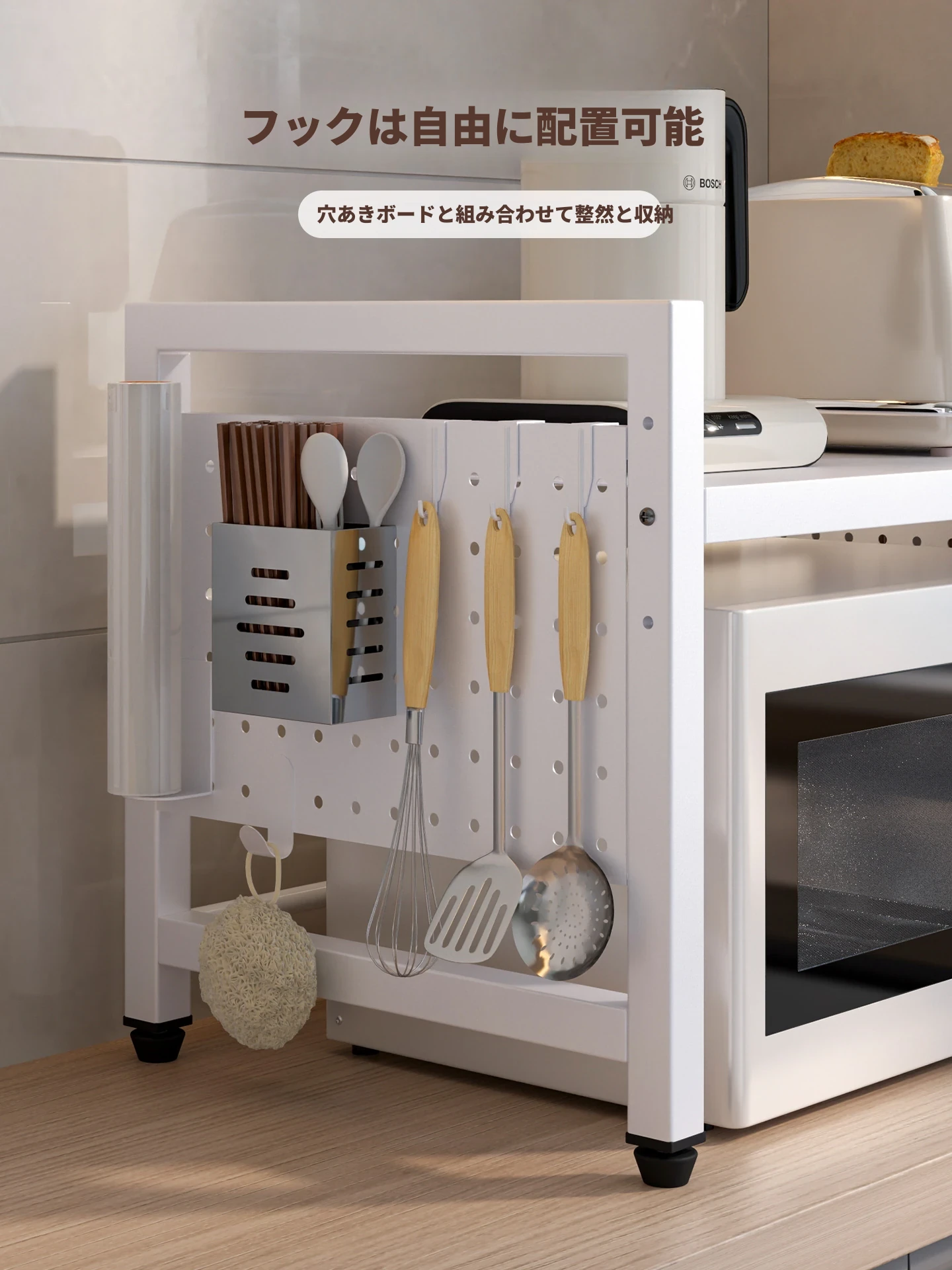 キッチンカウンター用多機能電子レンジラック!二段式の伸縮可能な収納棚で、オーブンや炊飯器をスッキリ整理。限られたスペースを有効活用し、料理の効率をアップ!