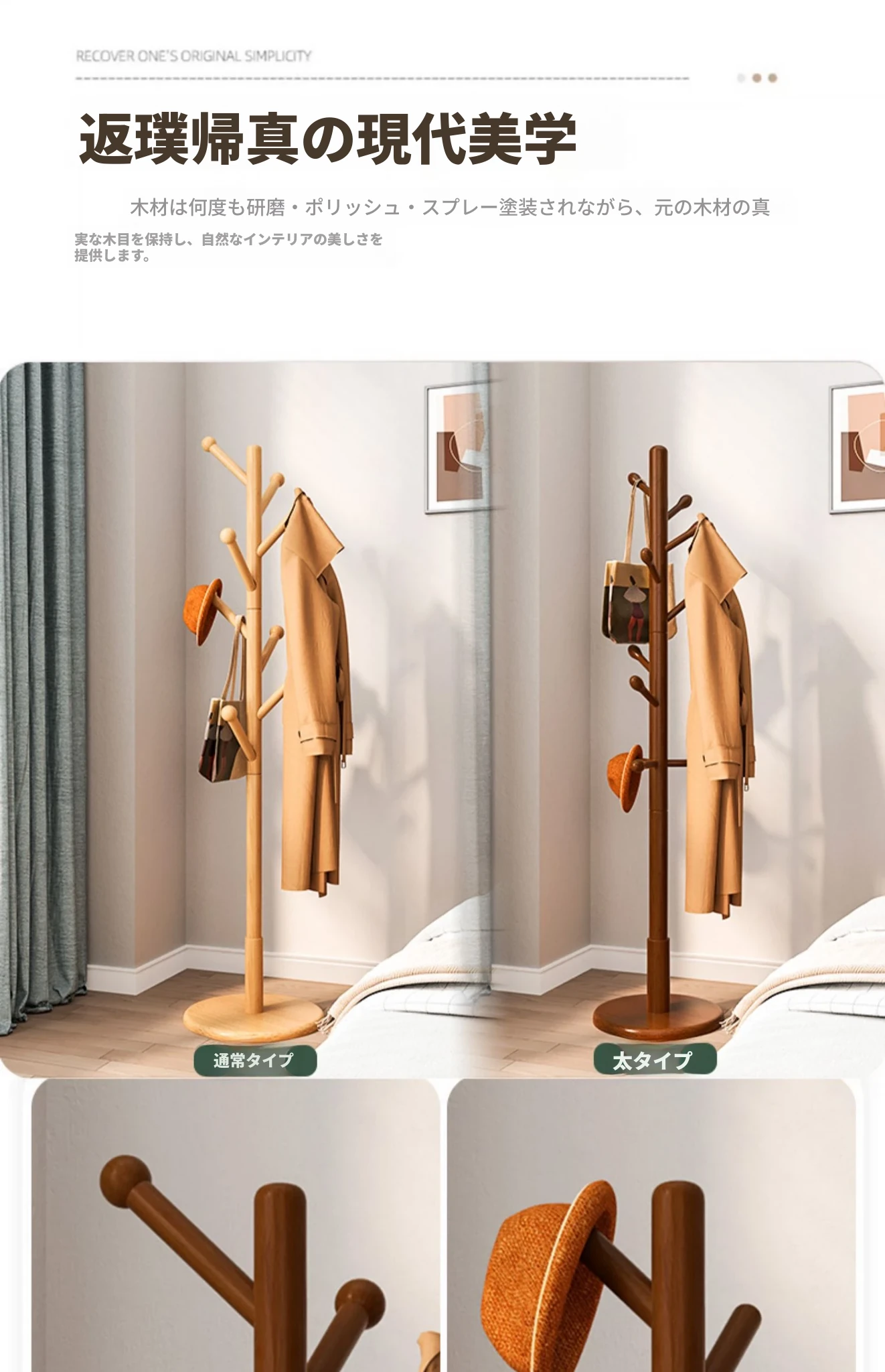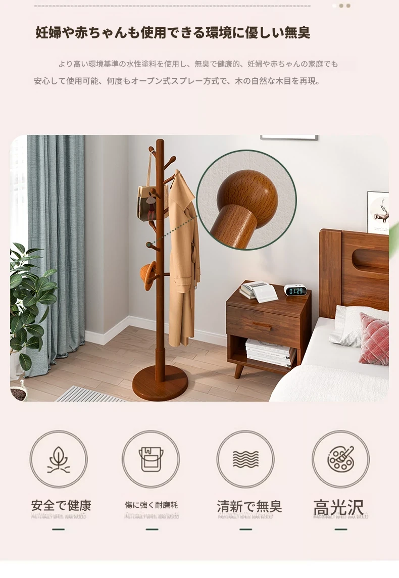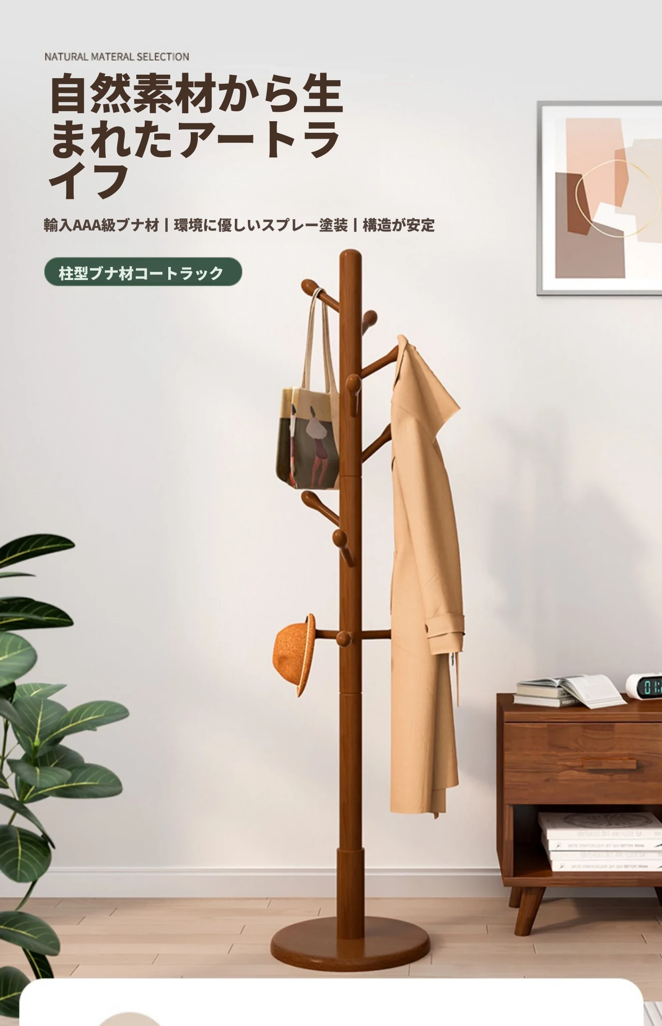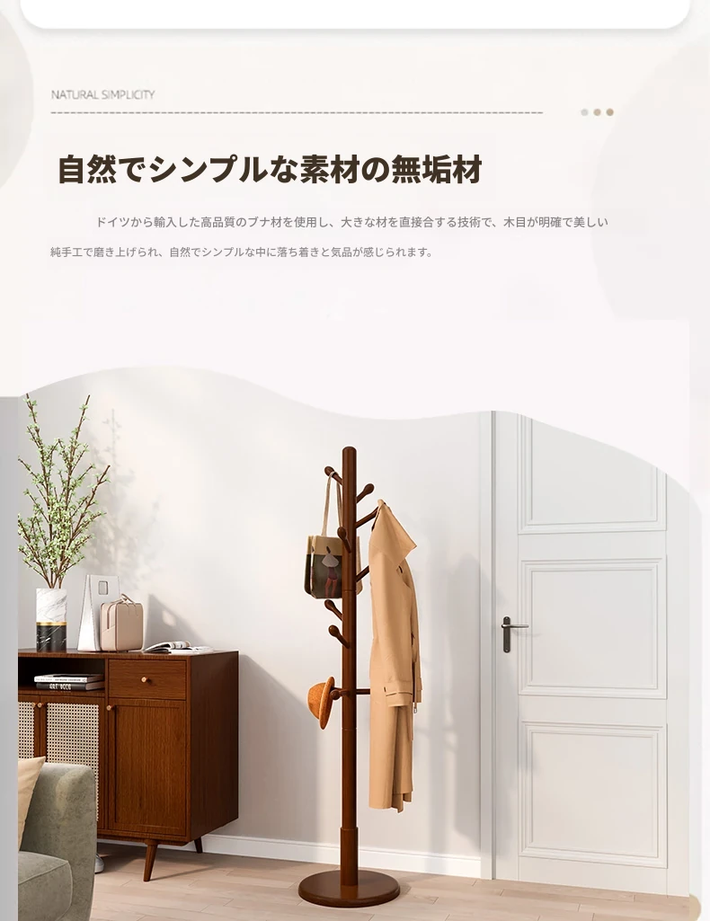 天然木製のスタンド型ハンガーラック - おしゃれな衣類&帽子掛け! シンプルなデザインで、寝室や大学の寮にもぴったり。丈夫なブナ材で、バッグも掛けられる多機能スタンド!お部屋をスッキリ整理整頓。