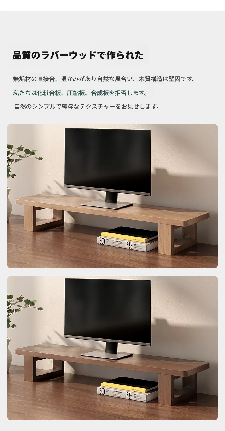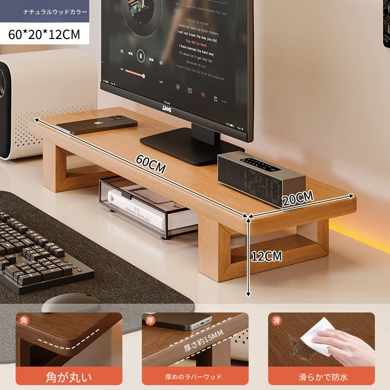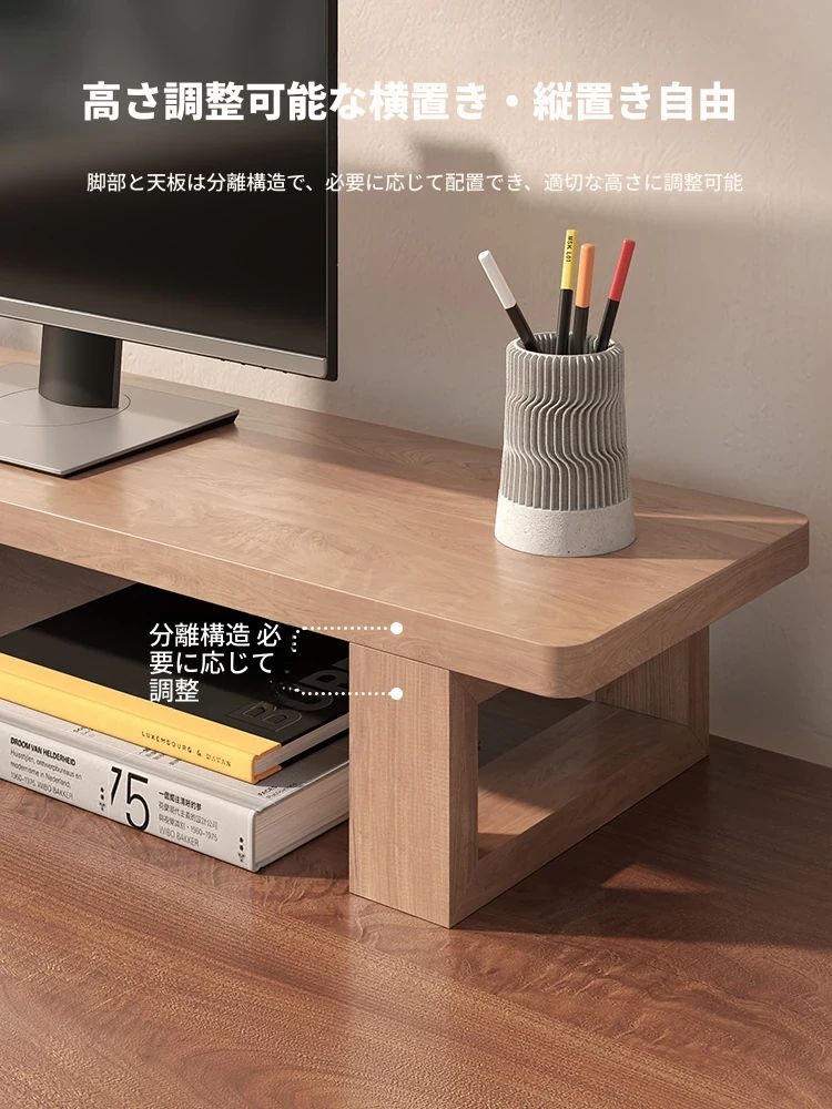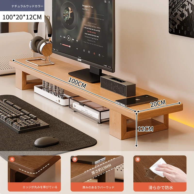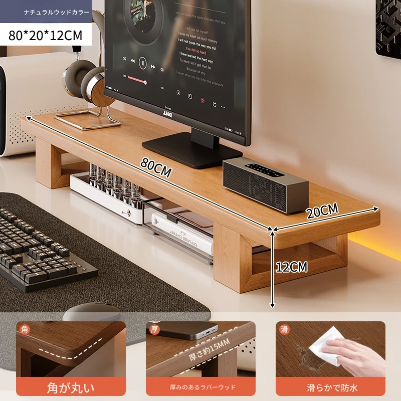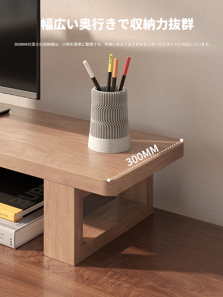 無垢材のパソコンモニター昇降スタンド - ヘーゼルウッド仕上げのデスクトップ収納ラック、キーボード収納にも最適!おしゃれで機能的なデザインで作業空間をスッキリ整えましょう!