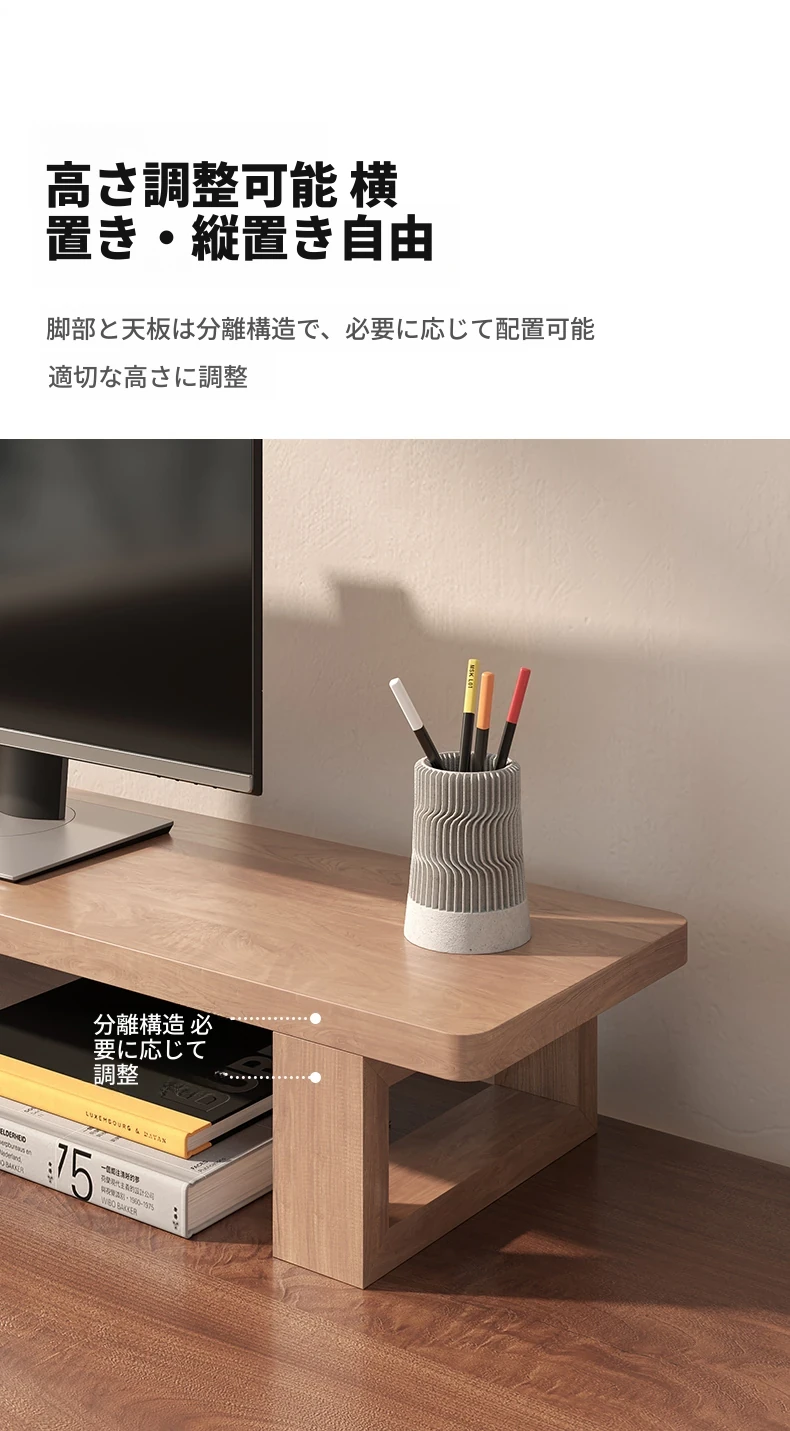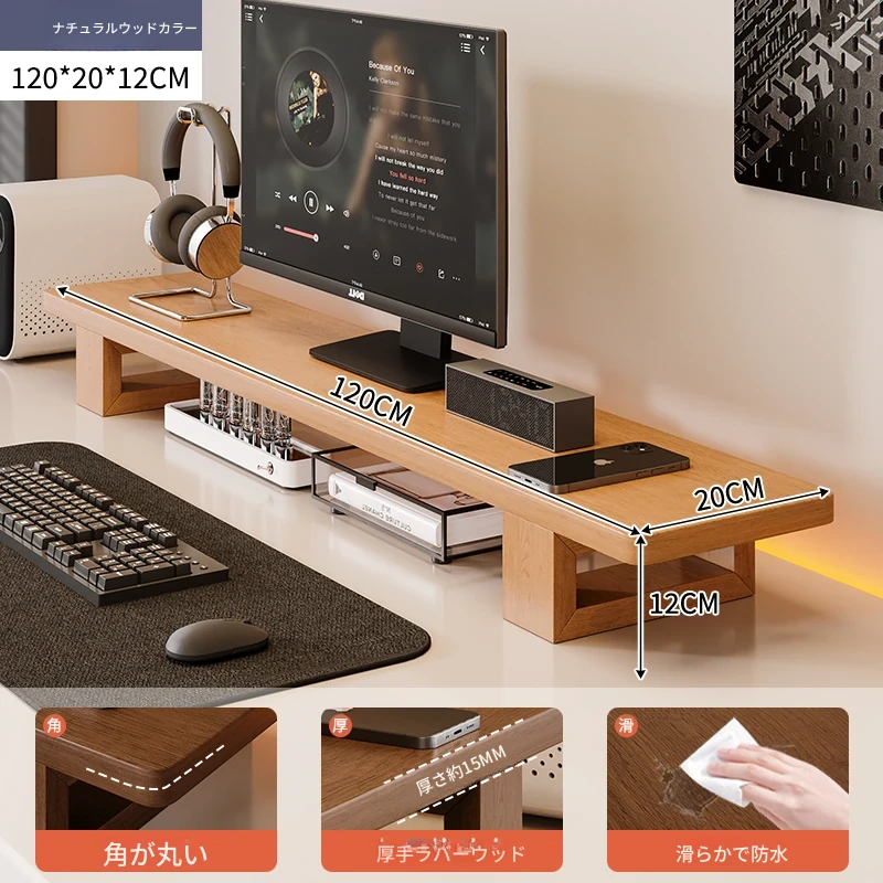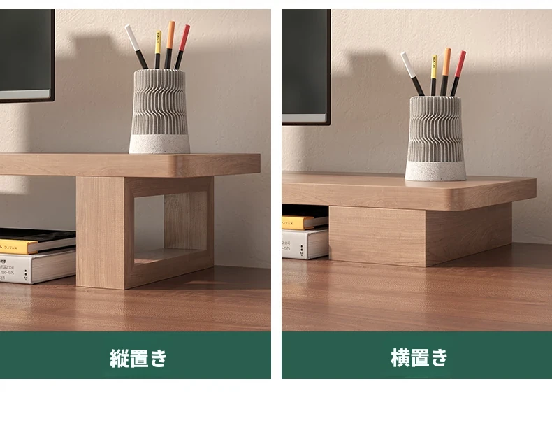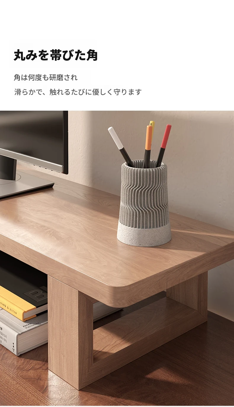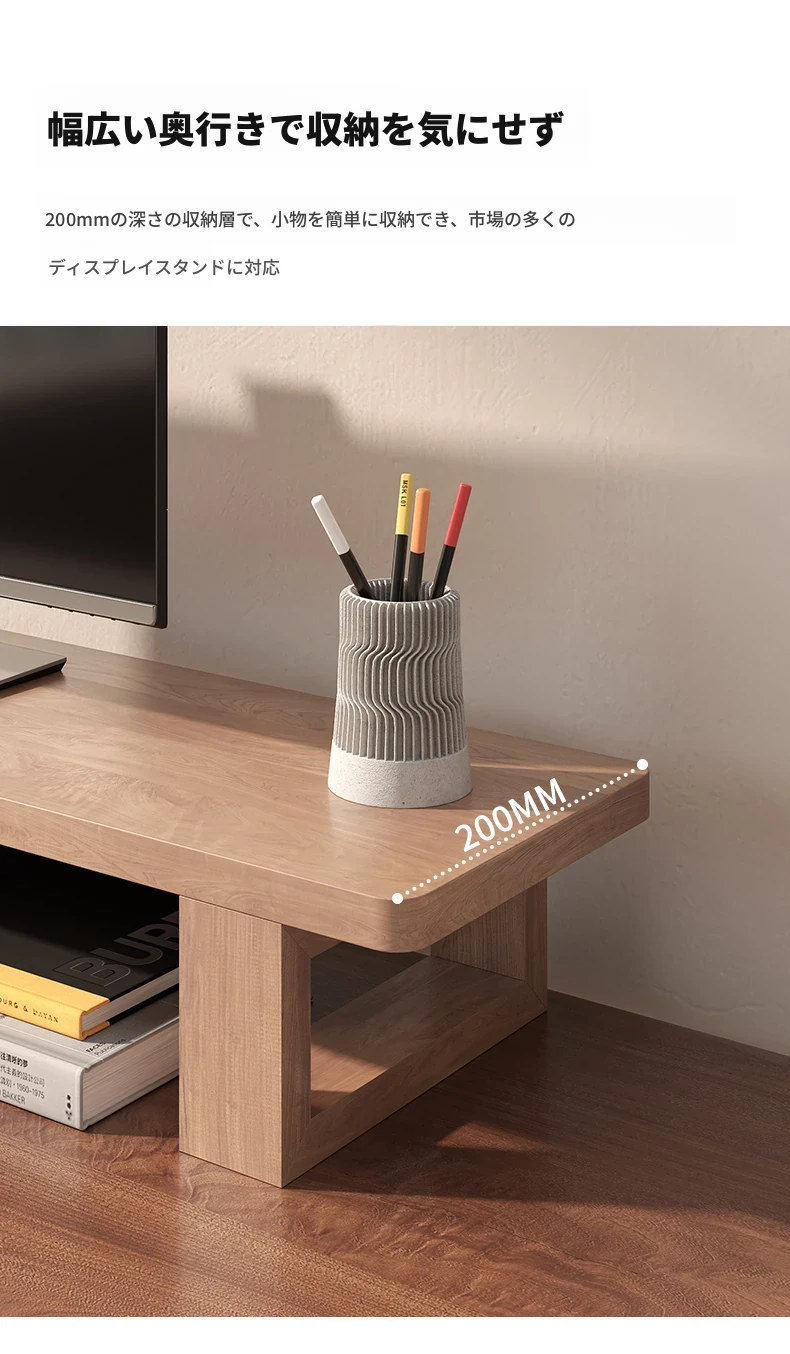 無垢材のパソコンモニター昇降スタンド - ヘーゼルウッド仕上げのデスクトップ収納ラック、キーボード収納にも最適!おしゃれで機能的なデザインで作業空間をスッキリ整えましょう!