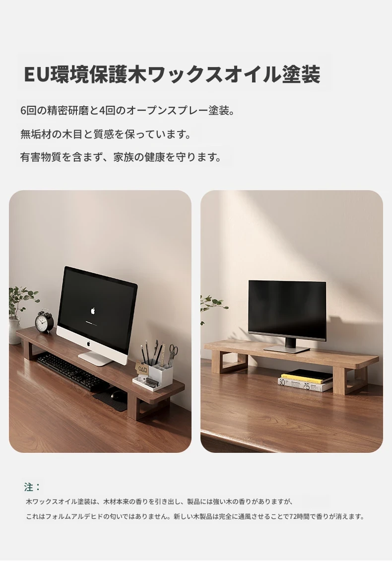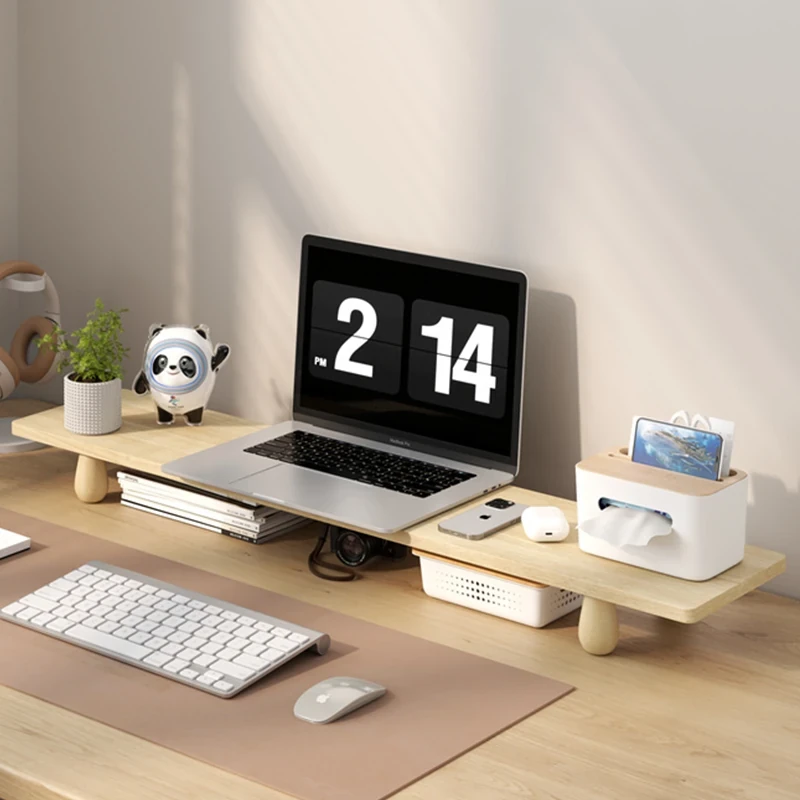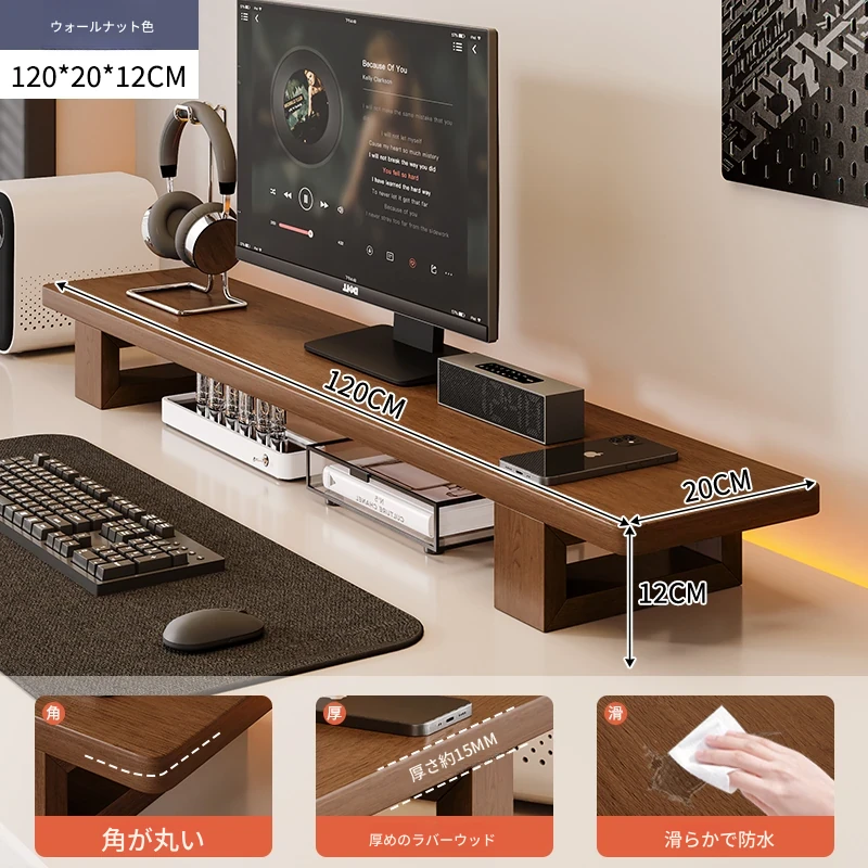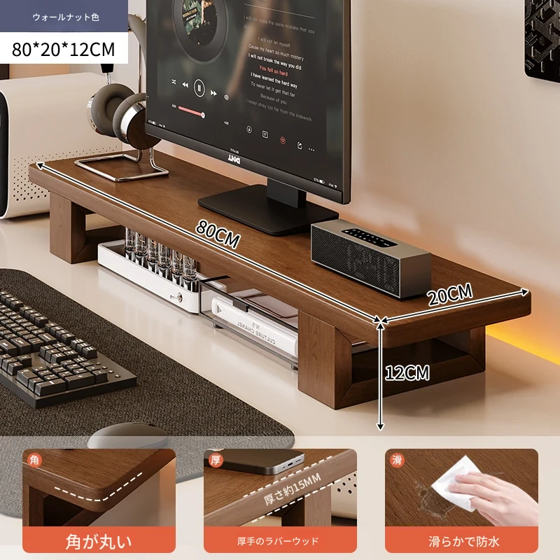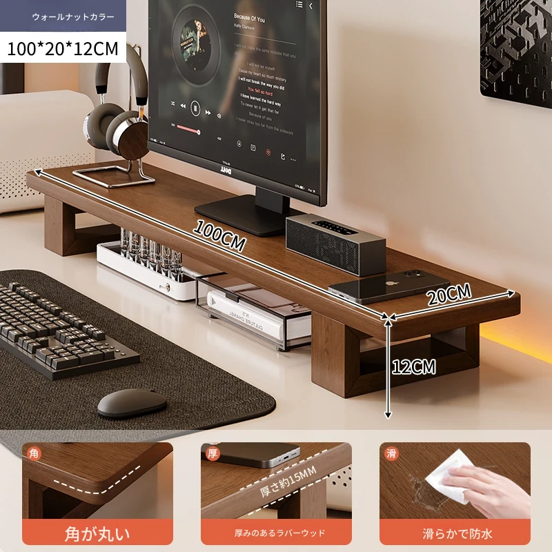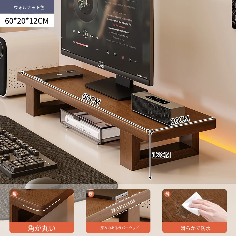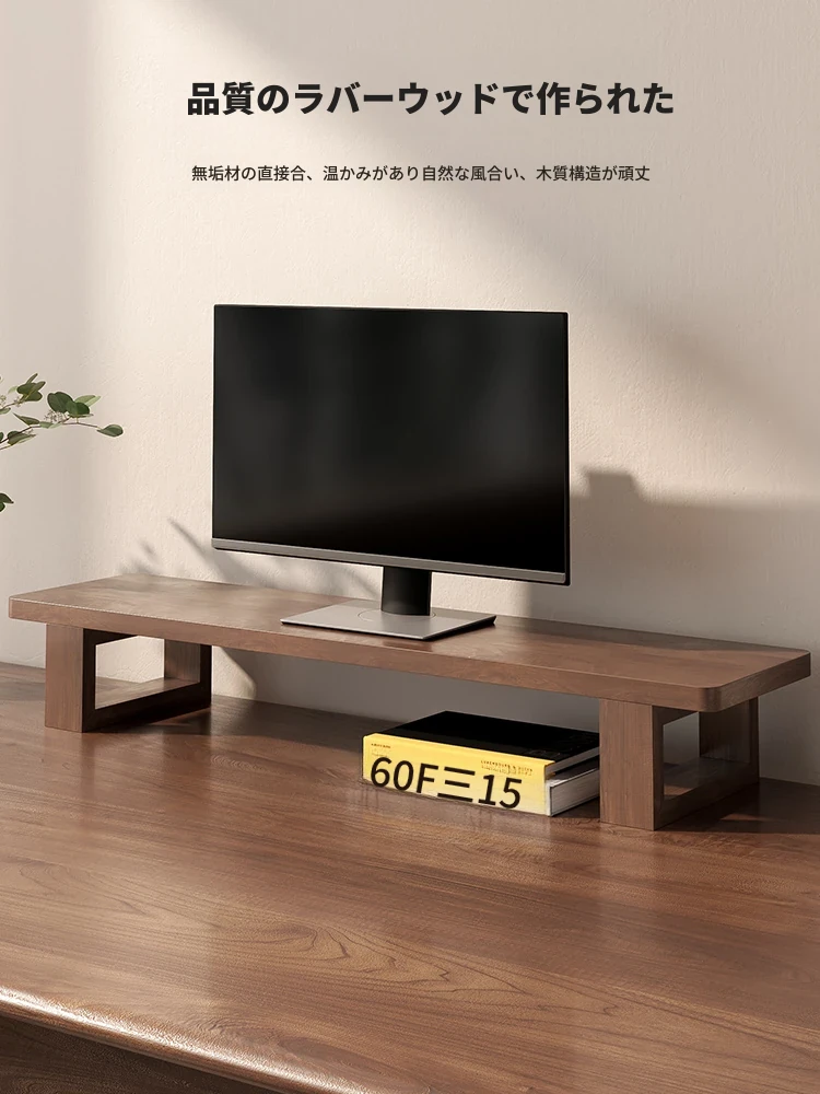 無垢材のパソコンモニター昇降スタンド - ヘーゼルウッド仕上げのデスクトップ収納ラック、キーボード収納にも最適!おしゃれで機能的なデザインで作業空間をスッキリ整えましょう!