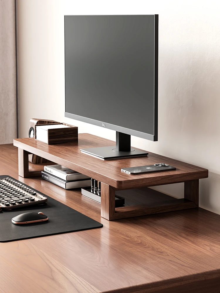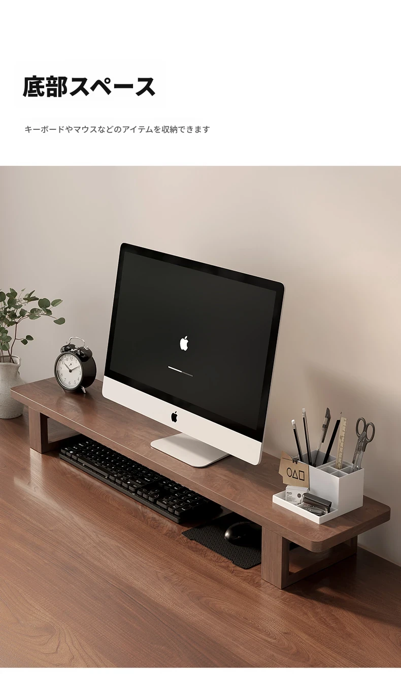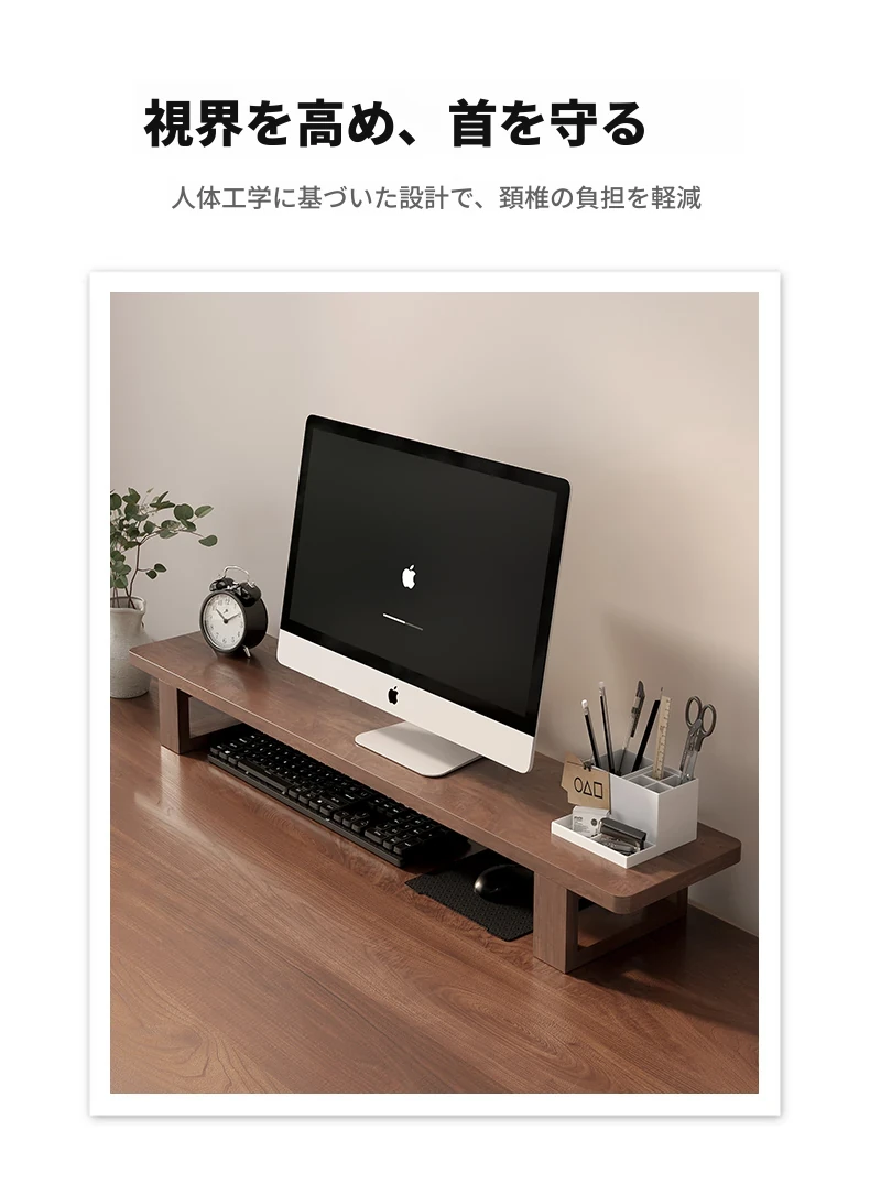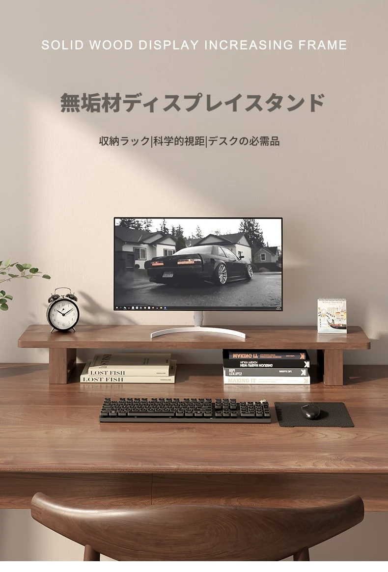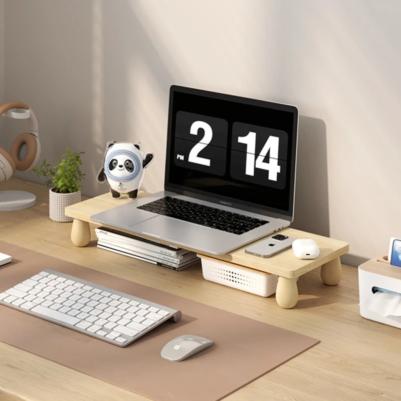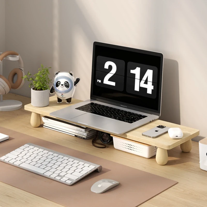 無垢材のパソコンモニター昇降スタンド - ヘーゼルウッド仕上げのデスクトップ収納ラック、キーボード収納にも最適!おしゃれで機能的なデザインで作業空間をスッキリ整えましょう!
