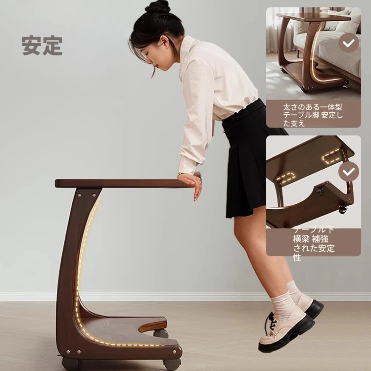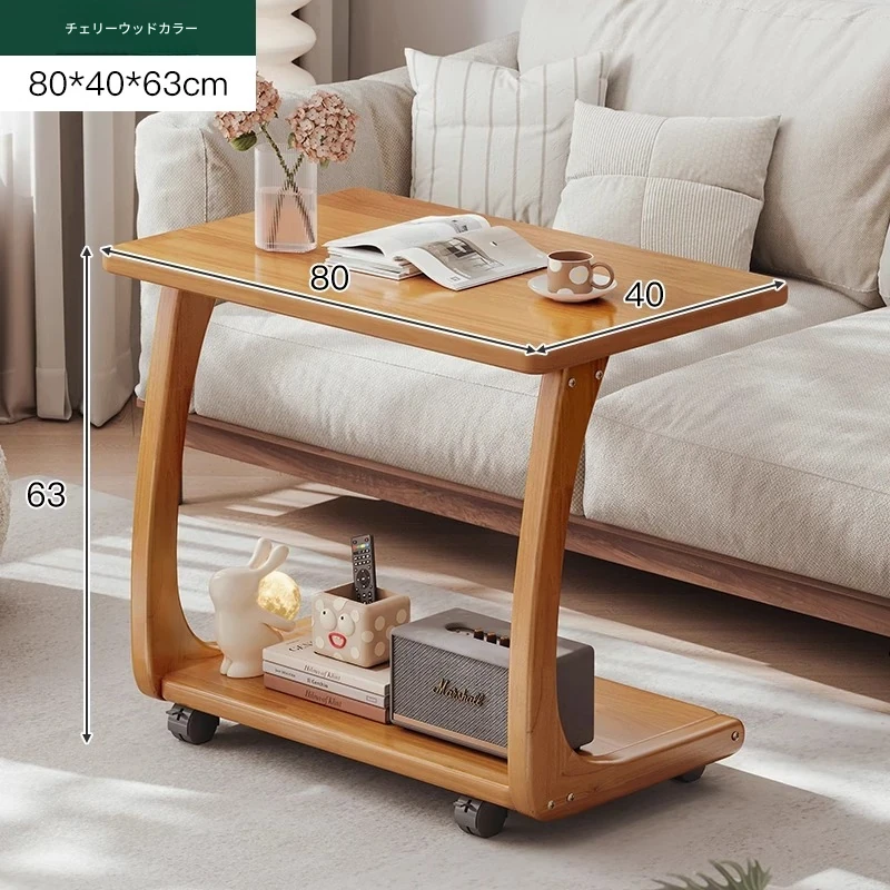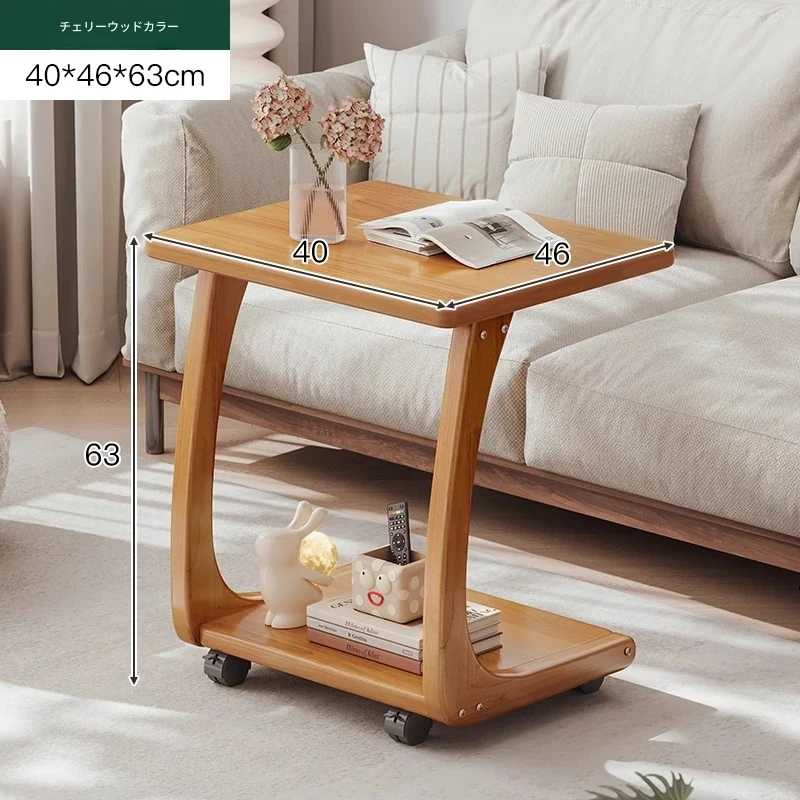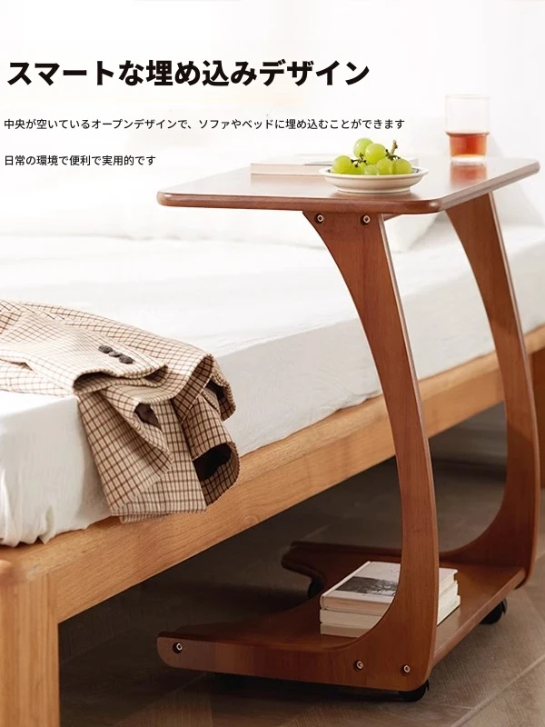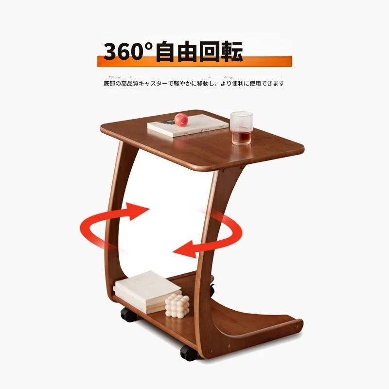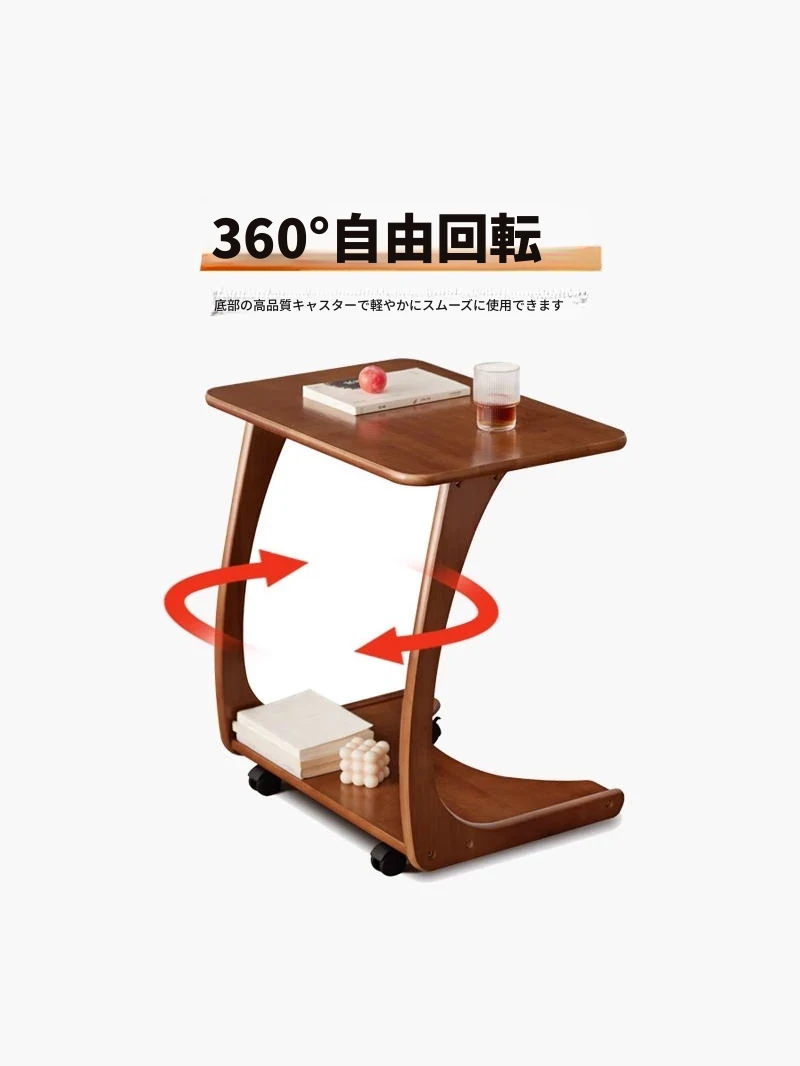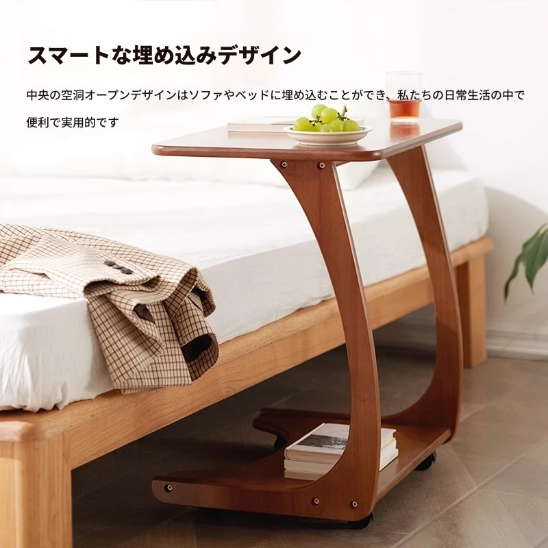 移動可能な実木製C型サイドテーブル - おしゃれで実用的!リビングやベッドサイドにピッタリ、狭いスペースでも大活躍。キャスター付きで簡単に移動でき、小さな部屋でも便利に使えます!