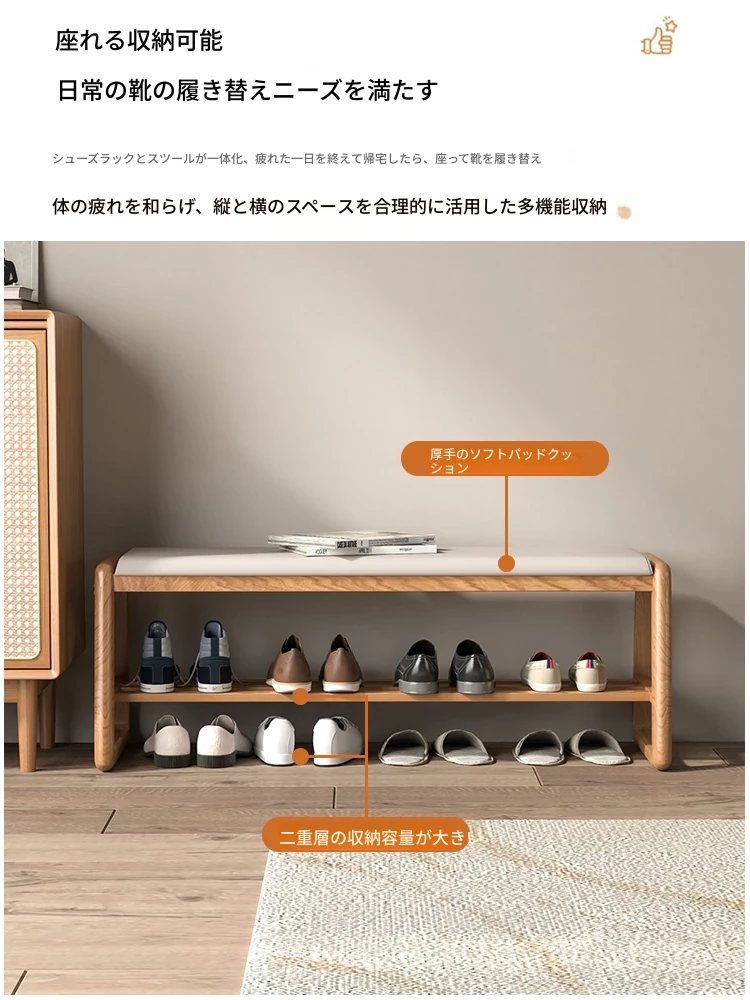 天然木製の靴ベンチ - 家庭用玄関スツール、シンプルなデザインで長椅子としても使用可能!クッション付きで座り心地抜群の靴ラック、靴収納にぴったりです。おしゃれで実用的な必需品!